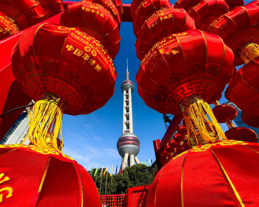 新春邻近,申城处处中国年味浓。一串串大红灯笼与东方明珠塔交相衬映,“中国红”映衬出红红火火的喜庆温顺 杨建正 摄