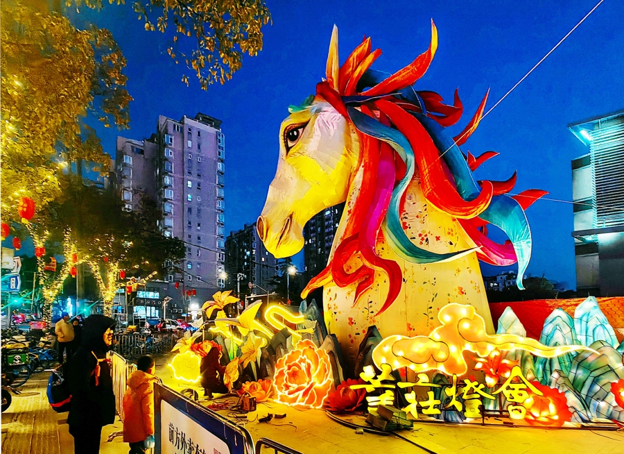 2026莘庄灯会“马啸漫空”灯组斯文耀眼,指导的线条与幻化的光影映衬马年主题,劝诱路东说念主安身杨建正 摄